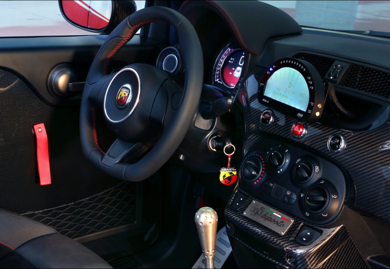 Салон Абарт 695 Бипосто создан для максимальной концентрации и контроля во время вождения. Интерьер выполнен в черном цвете с карбоновыми и алюминиевыми элементами. Спортивные сиденья Corsa by Sabelt оснащены кожаной обивкой с красными швами и регулируемую высоту, а также четырехточечные ремни безопасности Sabelt.