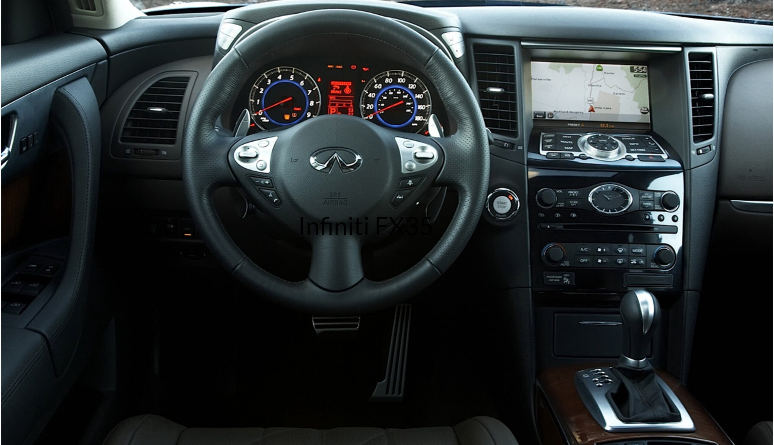 Салон Инфинити FX35 поражает своей роскошью, качеством материалов и технологичностью. Сиденья отмечены комфортным профилем и обтянуты кожей с серебристыми швами. Руль имеет эргономичную форму и многофункциональные кнопки управления. Приборная панель с цифровым дисплеем с подсветкой, показывает различную информацию о состоянии автомобиля.
