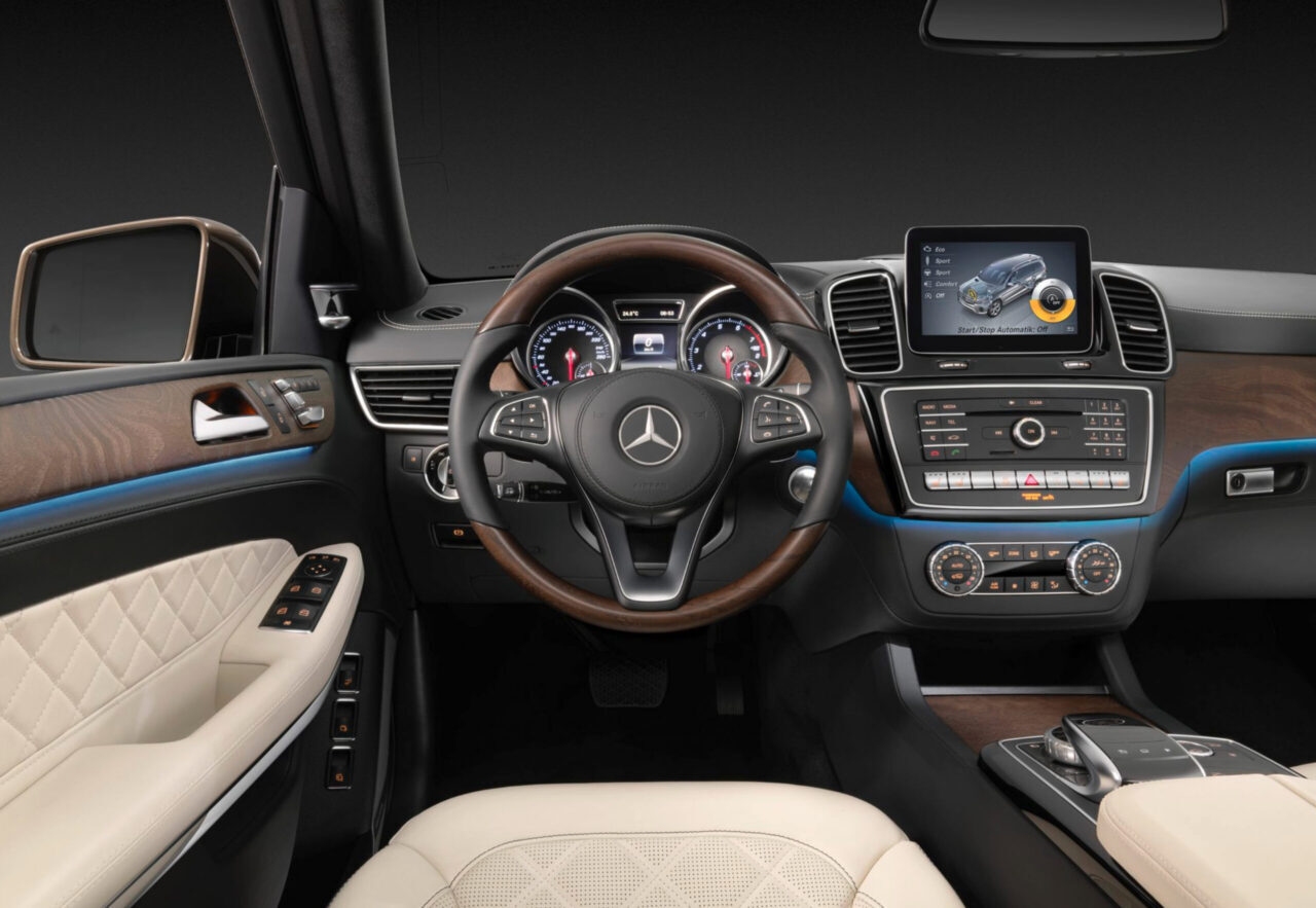 Салон Мерседес-Бенц GLS-Class сочетает в себе высокое качество материалов, продуманную эргономику и современные технологии. Приборная панель с цифровым дисплеем, который может отображать различную информацию о состоянии машины, навигации, мультимедиа и других функциях. Центральная консоль получила сенсорный экран, который управляет системой MBUX, позволяющей взаимодействовать с автомобилем при помощи голосовых команд, жестов или касаний.