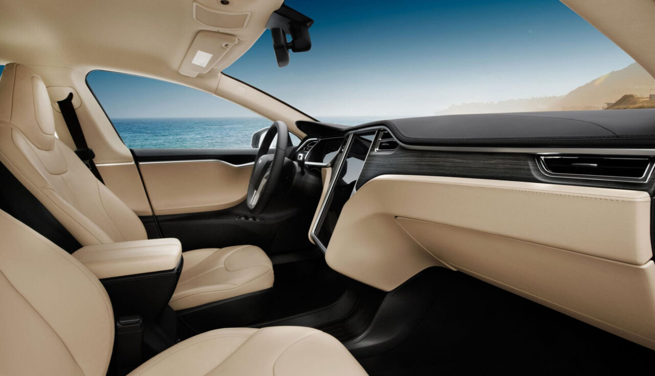 Салон поражает своей роскошью и функциональностью. Здесь царит атмосфера уюта и удобства, которая создается благодаря качественным материалам отделки, таким как кожа, алюминий и дерево. Приборная панель получила минималистичный и эргономичный дизайн, на котором расположены только необходимые элементы управления: руль с многофункциональными кнопками, цифровой приборный щиток с 12.3-дюймовым дисплеем и мультимедийная система с 17-дюймовым сенсорным экраном. Всеми остальными функциями машины можно управлять через приложение на смартфоне или голосовые команды.