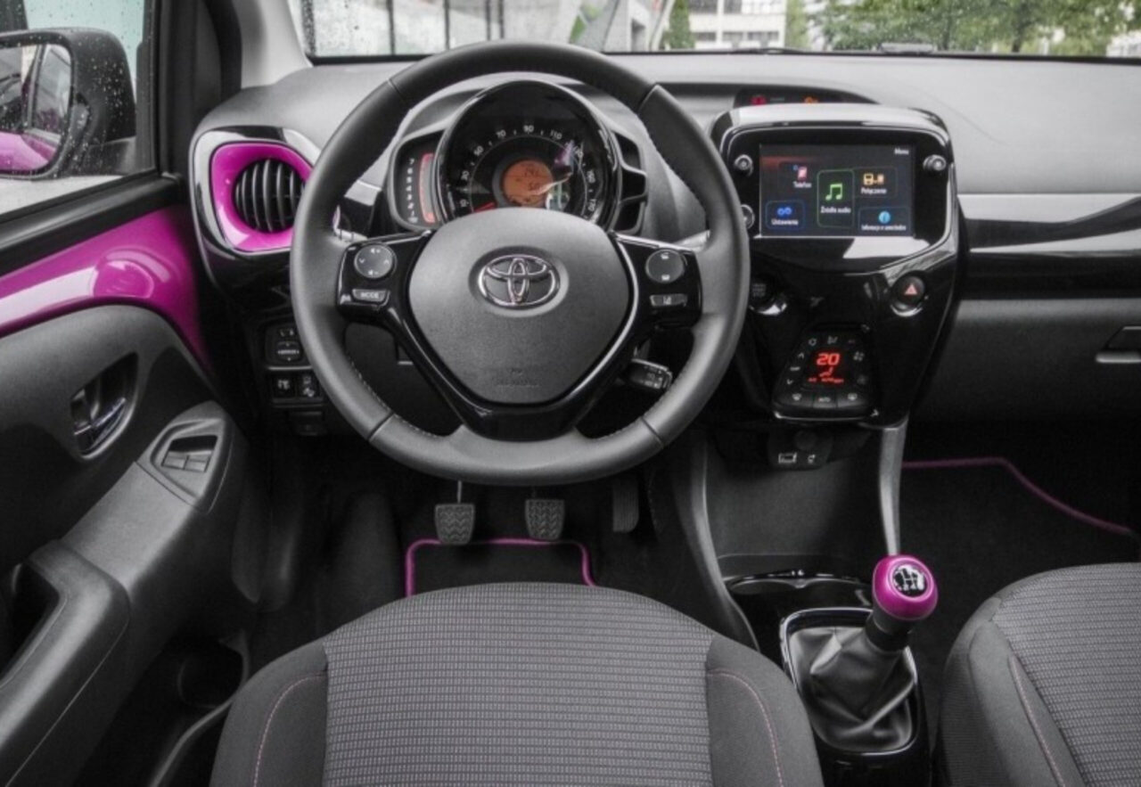 Салон Тойота Айго также отличается оригинальностью и функциональностью. Он выполнен из качественных материалов с эргономичным дизайном. На приборной панели расположен цифровой спидометр и аналоговый тахометр, а также 7-дюймовый сенсорный экран мультимедийной системы с поддержкой Apple CarPlay и Android Auto. Система также включает в себя Bluetooth, USB-порт, камеру заднего вида и навигацию.